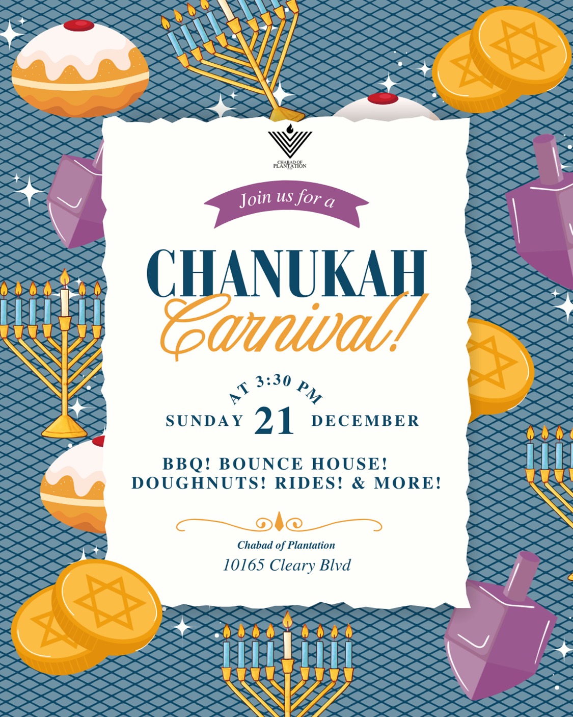 Chanukah Carnival!Sun, Dec 213:30 PMDescriptionBBQ! Bounce House! Doughnuts! Rides! & more!LocationChabad of Plantation10165 Cleary BlvdPlantation, FLView on MapAgesAll AgesCategoriesFestivals & EventsJewish HolidayShare: