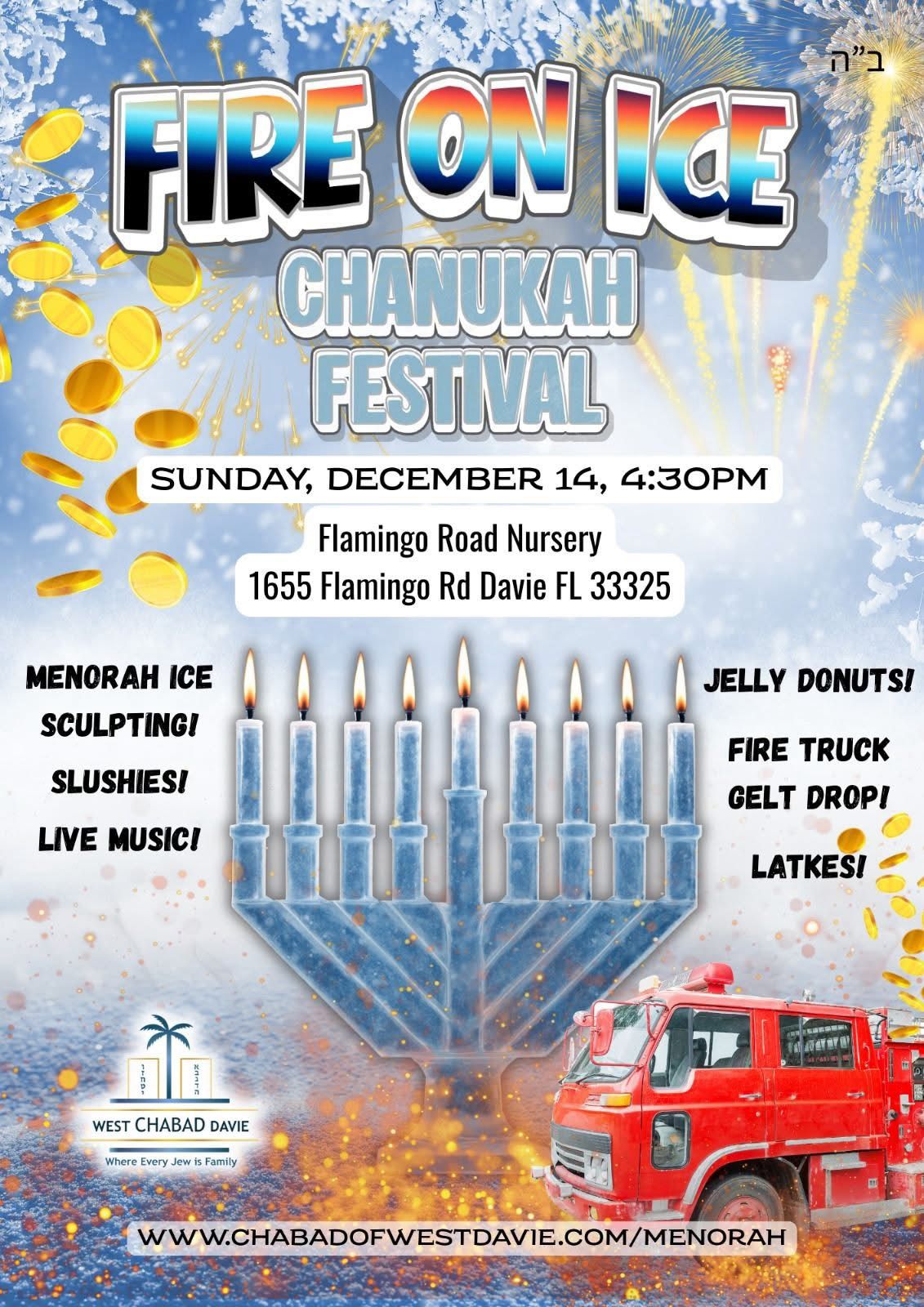Family Chanukah festival featuring menorah ice sculpting, chocolate gelt drop, latkes, jelly doughnuts, music, and more. There will also be slushies and a fire truck.