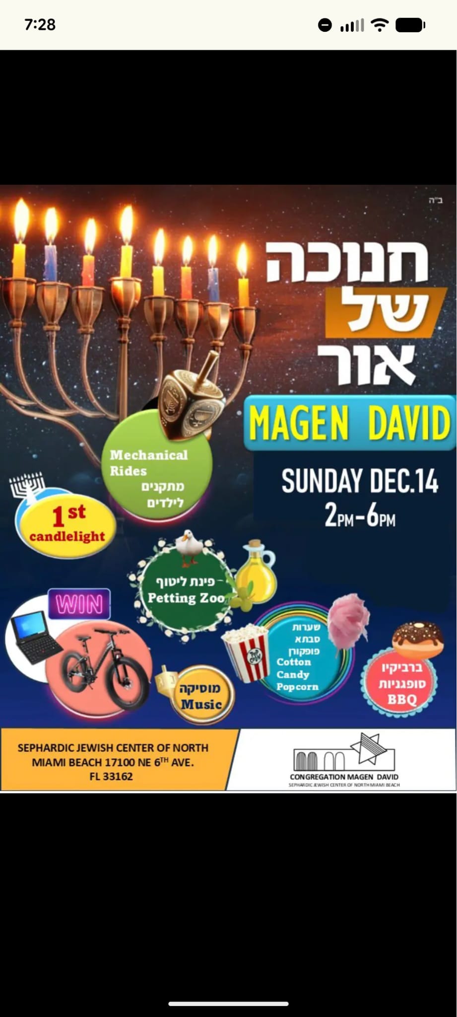 Hanukkah event with mechanical rides, petting zoo, music, cotton candy, popcorn, and BBQ.