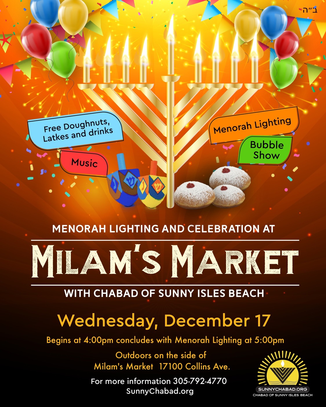 Menorah lighting with free doughnuts, latkes, drinks, music, and a bubble show.