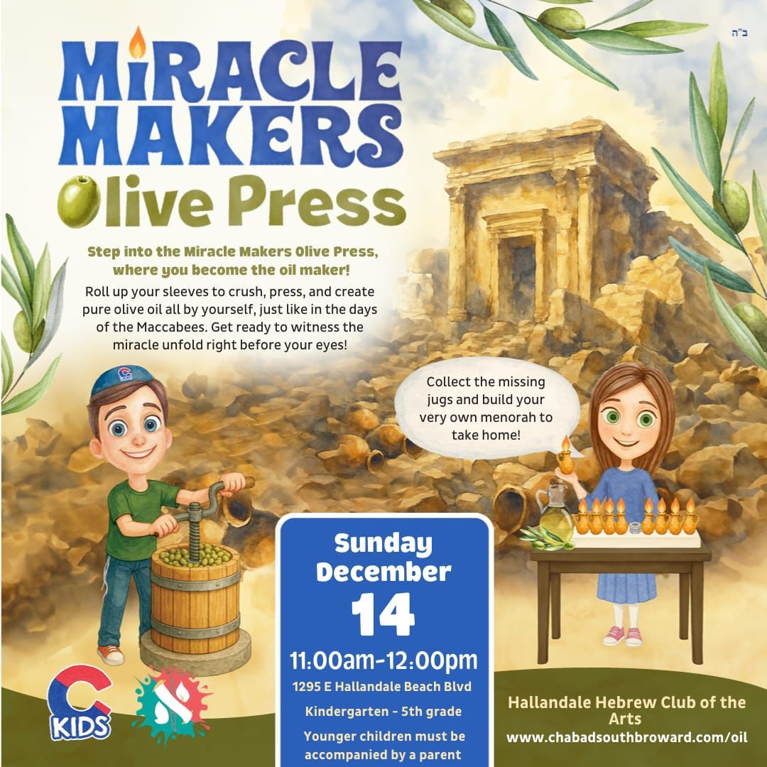 Step into the Miracle Makers Olive Press, where you become the oil maker! Roll up your sleeves to crush, press, and create pure olive oil all by yourself, just like in the days of the Maccabees. Get ready to witness the miracle unfold right before your eyes! Collect the missing jugs and build your very own menorah to take home!