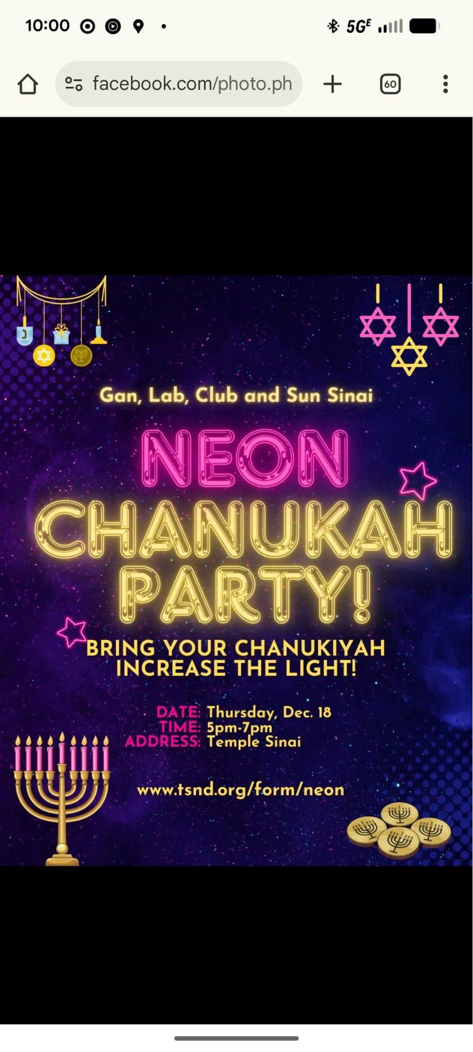 Neon Chanukah Party!Thu, Dec 185:00 PMMulti-dateDescriptionBring your Chanukiyah, increase the light!LocationTemple SinaiTemple SinaiFLView on MapAgesAll AgesCategoriesJewish HolidayFestivals & EventsShare: