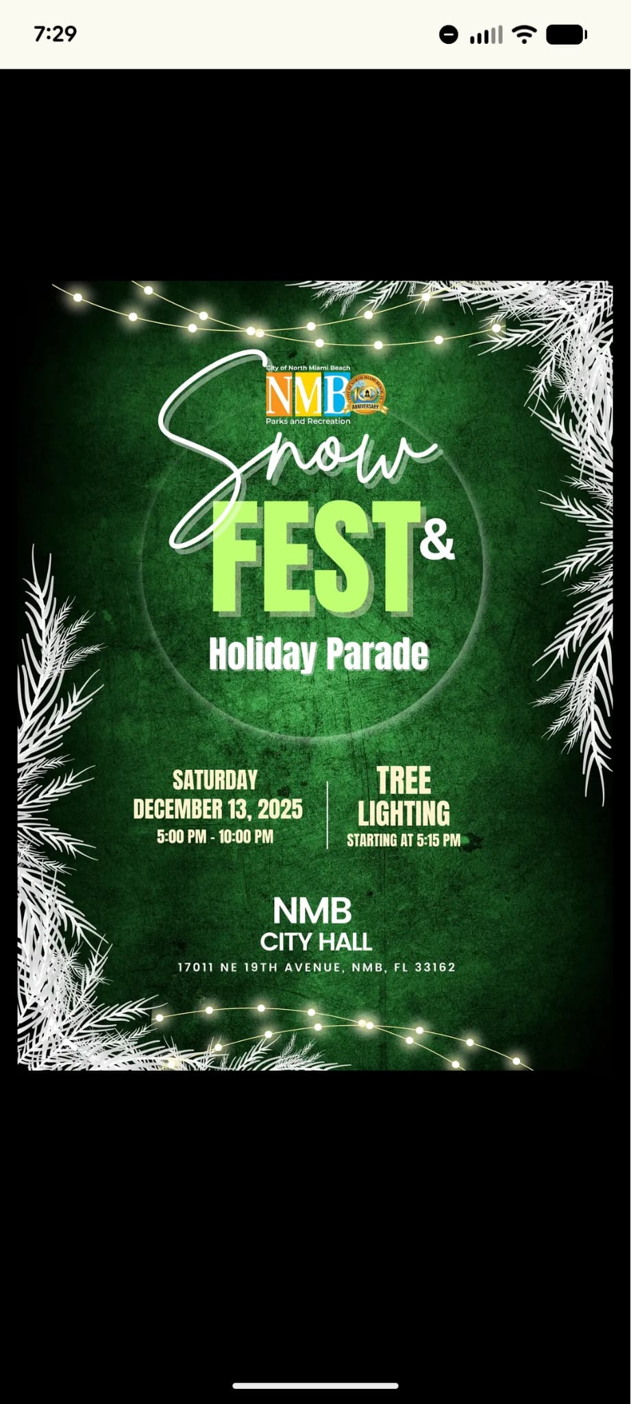 Snow Fest & Holiday ParadeSat, Dec 135:00 PMMulti-dateFreeDescriptionHoliday ParadeLocationNMB City Hall17011 NE 19th Avenue, NMB, FL 33162North Miami Beach, FLView on MapCategoriesFestivals & EventsHolidayShare: