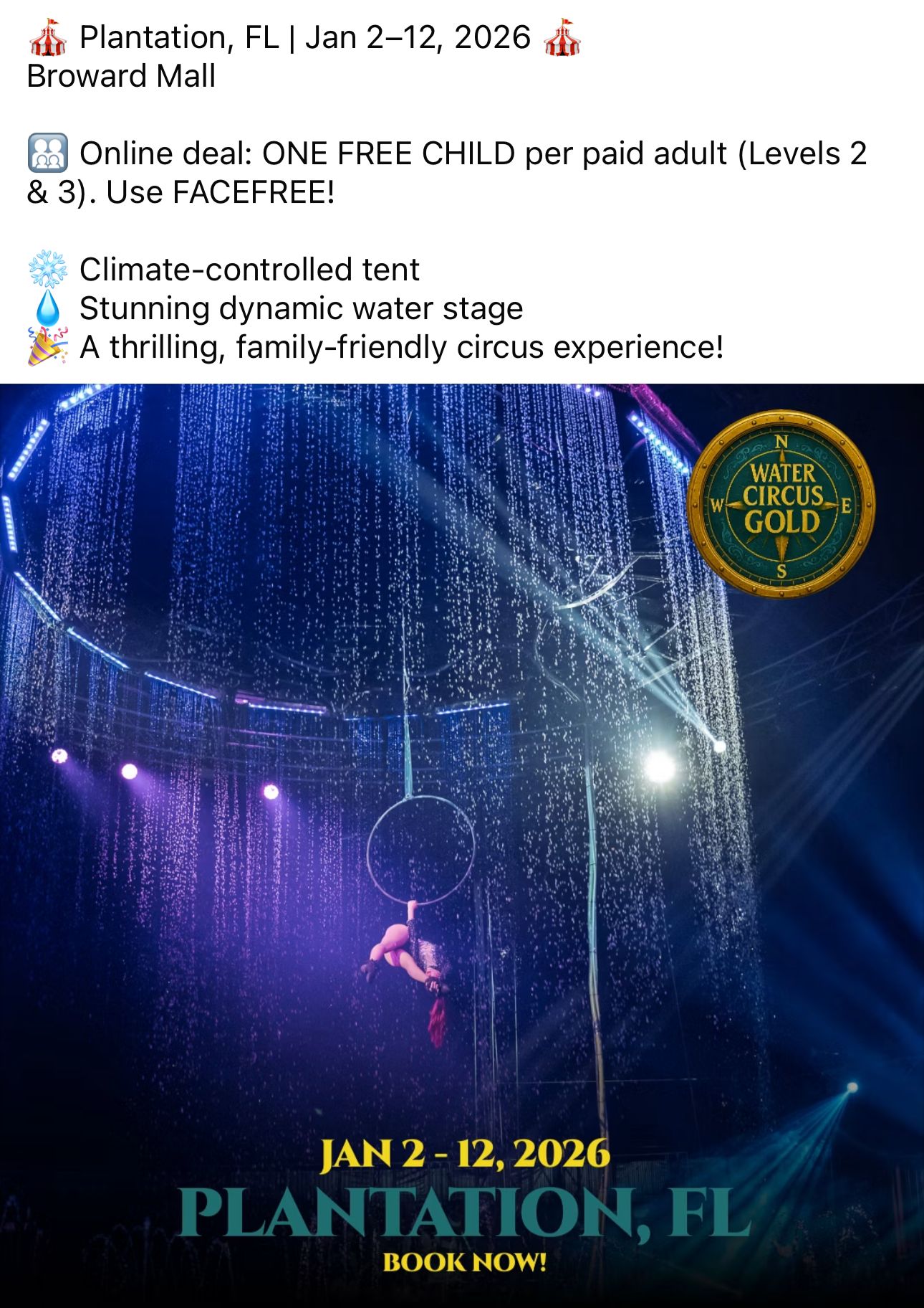 Water Circus GoldFri, Jan 2Multi-date$0Hand picked byKoralDescriptionA thrilling, family-friendly circus experience!LocationBroward MallPlantation, FLPlantation, FLView on MapAgesAll AgesCategoriesArts & CreativeFestivals & EventsShare: